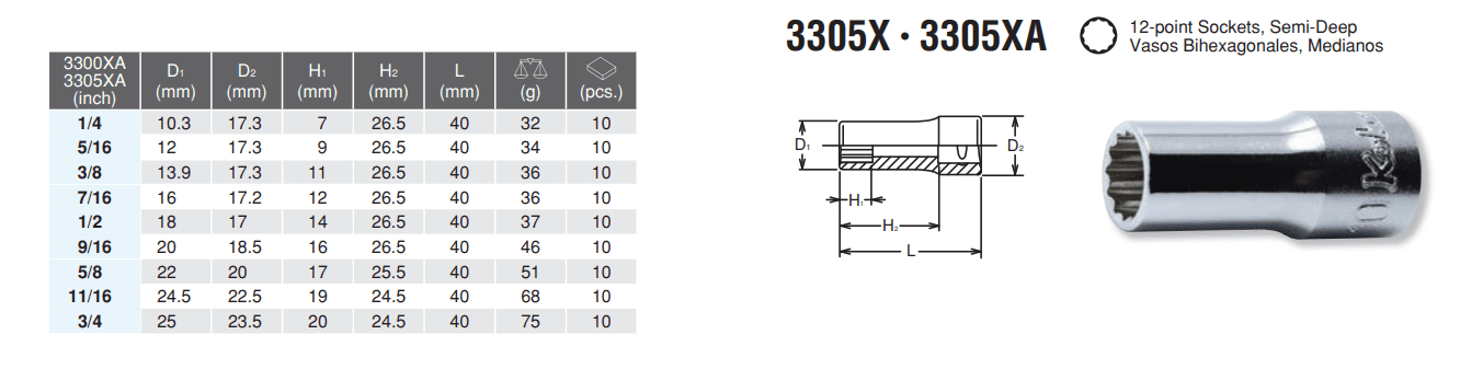 3/8″ 12 POINT SEMI-DEEP SOCKET 3305XA