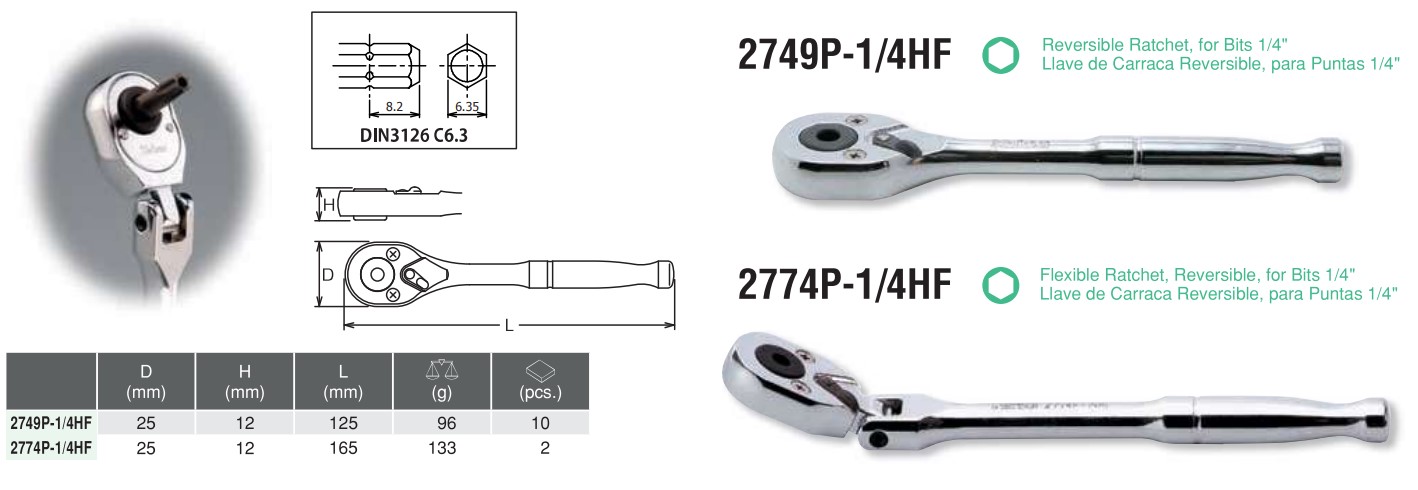 Flexible Ratchet, Reversible for Bits 1/4″ 2774P-1/4HF